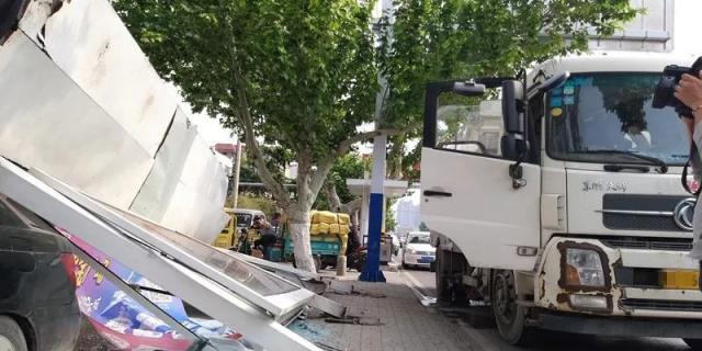 在現(xiàn)場看到,闖禍的洗掃車,停在東側的非機動車道上,而旁邊被撞的公交站臺已經(jīng)倒地,站臺棚損毀嚴重,站臺下面還砸著一輛黑色私家車。