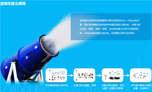 2.功轉換效率高、射程遠、覆蓋面積大、霧粒細小且均勻、抑塵效果好。水霧與飄在空中的塵埃接觸時,被塵埃所吸附,加大塵埃的比重,抑制塵埃在空氣中的流動,并加速塵埃沉降,實現對空氣的凈化。