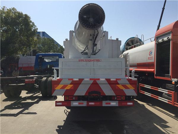 抑塵車風送系統啟動后,起動噴霧系統,先關閉噴霧截止閥,使藥液泵泵出的水匯流到藥箱工作5分鐘,使農藥和水充分混合。打開噴霧截止閥噴霧,調節液泵壓力調節裝置,使工作壓力在規定要求下。