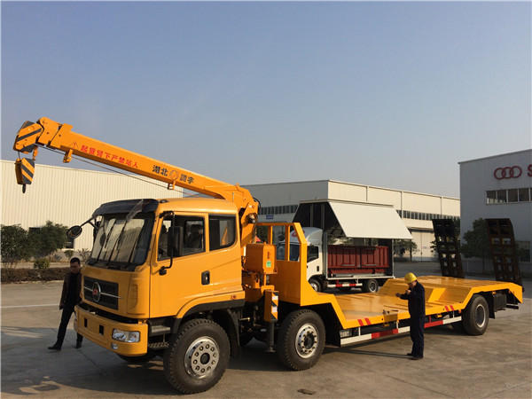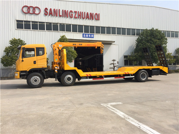東風前四后八凹梁隨車吊,前四后八凹梁隨車吊采用凹梁下沉結構好處在于平板離地高度低重心穩,專利凹式設計,凹梁式隨車吊平板車,凹式隨車吊平板車,主要用于30噸左右挖掘機運輸,裝載機運輸,收割機運輸,壓路機運輸等工程機械和不可拆卸物體的運,本產品是我們廠家專利產品,全國有此公告僅此一款,缺點在于凹梁設計易斷大梁和前方向拐臂,采用TT530豪華活D913駕駛室,玉柴310馬力國五發動機,5.5噸前橋13噸后橋,法士特10檔變速箱,10.00R20鋼絲胎,方向助力、斷氣剎、abs防抱死、空調,總質量31噸,上戶噸位18.45噸,車身自重12.35噸,標準型上裝橫梁采用12*12規格6mm厚方鋼,整根貫穿式設計,保證承載性能,貨箱平板10mm厚花紋板;重載型上裝橫梁采用12*10規格8mm厚方鋼,整根貫穿式設計,承載性能更好,貨箱平板8mm厚花紋板,爬梯采用重載加強型設計,采用三道筋雙簧加固處理,帶有后支腿,平板帶有斜支撐,貨箱平板可以伸縮,伸出3米,縮回2.5米,是運輸30噸-40噸大型挖掘機、大型工程機械等最理想的拖車。