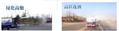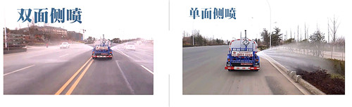 灑水車前裝有鴨形噴嘴或圓頭沖嘴,后面裝有圓柱開灑水噴嘴或蓮蓬頭噴嘴,后部有一工作平臺,裝配有水炮。后部還可裝8個噴嘴(選裝)噴水器一般用于沖洗街道,起除塵和降溫作用,其噴水器可以用調節噴嘴螺紋的方法改變噴水器的噴灑方向和角度,高射水炮可以用于城鄉園林綠化及應急消防。蓮蓬嘴可以澆落路中間噴水器沖起的灰塵,起到清潔空氣的作用。