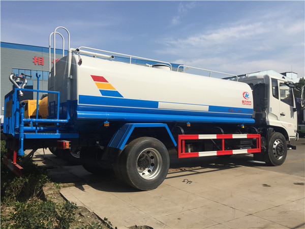 灑水車前裝有鴨嘴型噴霧或圓頭沖嘴,后面裝有圓柱形灑水砣,側(cè)噴花灑蓮花頭,車后部裝有高射噴槍。(選裝)
