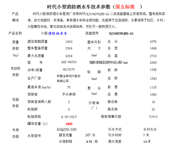該車采用東風朝陽95馬力柴油發動機和江蘇四達95馬力柴油發動機,7.00-16輪胎,汽剎,5檔變速箱,2噸前橋,4噸后橋,整車外形尺寸:長×寬×高(mm)5990/1950/2300,總質量(kg)6495,額載質量(kg)3100,罐體有效容積:3噸-5噸,帶國家免征公告。帶專用灑水泵,可自吸自排,帶前沖后灑,側噴,后工作平臺上配灑水高炮.