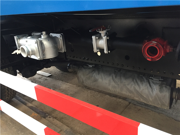 灑水車在應急消防時,其操作程序是:調節三通球閥 G 到如圖位置(注意:三通球閥凹坑所對方向關閉),關閉不銹鋼球閥 A、B、C、D、E 和鋁合金球閥 H,打開消防栓 I 和不銹鋼球閥 F,踏下離合,打開取力器開關,慢慢松開離合(千萬不可過快,否則將會損壞取力器或變速箱),使水泵開始工作,即可通過灑水炮和消防栓出口應急消防,停止工作后開關回位。