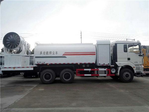 東風12噸天錦多功能帶霧炮的抑塵車罐體采用4mm厚武鋼產專用容積板制作,采用機器壓板一次性成型技術,采用先進旋邊機,罐體包罐機工藝保證了罐體制作的精度和美觀。罐體內采用先進的對接焊技術,罐體焊后采用噴丸漏檢測,使罐體具有強度高、重心穩,車輛運載安全平衡等特點。前沖(噴),后灑,帶側噴,后置工作平臺,平臺上安裝綠化灑水高壓炮(炮噴射形狀可調成直沖狀、大雨、中雨、毛毛雨、炮可360度旋轉,射程>35米)。帶自流閥,消防接口。帶自吸泵,可將池塘的水直接吸入罐體內也可直接從城市街道消防栓上連接注水,吸入罐體內。罐前量管(觀察罐內水位)、罐后爬梯、罐上罐口帶簡易護欄、罐側雙炮筒,罐體表面雙層油漆工藝,防銹、耐腐蝕,其余有廠家標配??蛇x擇加裝加裝藥盤、氣動控制閥、噴藥設備、罐內防腐等。多功能帶霧炮的抑塵車也可做噴藥車使用,可根椐用戶要求進專業噴藥防腐處理,也可做企業單位運水用,緊急時可做消防車使用。