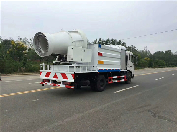 東風12噸抑塵車選配50米噴霧機達到除塵效果。霧炮機是根據風送原理,先使用進口高壓泵、微細霧化噴嘴將水霧化,再利用風機風量和風壓將霧化后的水霧送到較遠距離,使得水霧到達較遠距離同時能夠覆蓋更大面積,水霧與粉塵凝結后降落,從而達到降塵目的。