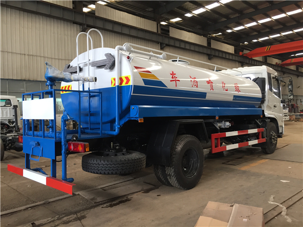 上裝配置:罐體有效容積12立方,采用5毫米厚武鋼碳板板自動焊接制作,配品牌大功率灑水泵,帶前噴后灑側噴,尾部平臺帶高位水炮,可自吸自排。前沖14米寬,水炮射程28米,自吸深度7米。
