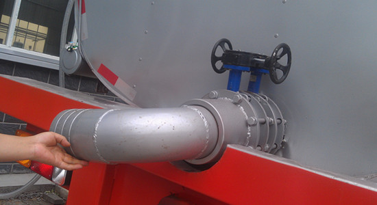 瀝青運輸車的自流口裝置可以選擇如下圖制作方式,帶彎頭的自流口,而且可以左右轉動,這樣方便卸料,左右卸料都不受影響。