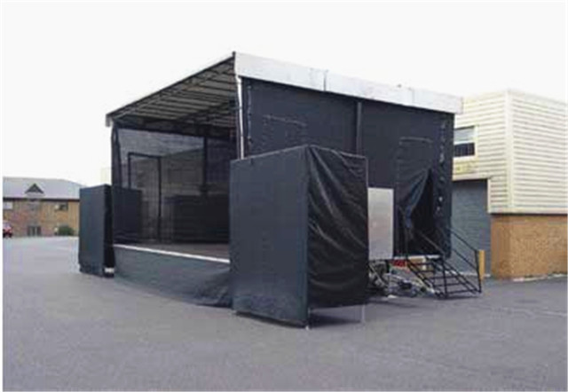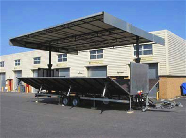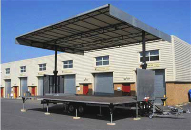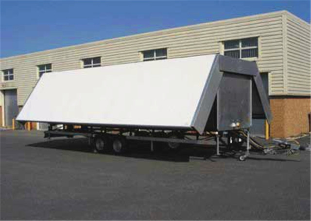 右側外板及頂板右側通過液壓舉升至與臺面垂直位置,形成遮陽、擋雨、燈光固定的頂棚及廣告的承載面。側板和頂板分別由四個液壓油缸控制展開即成舞臺的臺頂,底板也由四個液壓油缸控制,省去傳統搭臺程序,省時省力操作簡便安全可靠。